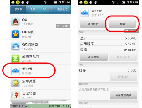 依次打開設(shè)置->應(yīng)用程序->管理應(yīng)用程序->安心云.(如圖2所示)點(diǎn)擊安心云圖標(biāo),打開卸載界面點(diǎn)擊卸載按鈕即可。(如圖3所示)