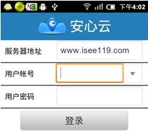 點(diǎn)擊軟件“安心云”的圖標(biāo),輸入“服務(wù)器地址”、“用戶賬號”、“用戶密碼”,點(diǎn)擊登陸即可。如圖4所示。(服務(wù)器地址:www.isee119.com)