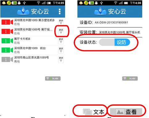 成功登錄之后,會(huì)顯示用戶名下面的所有設(shè)備,點(diǎn)擊“更多”可查看設(shè)備的“詳細(xì)信息”,在“文本”頁面的“設(shè)備狀態(tài)”處點(diǎn)擊“布防”和“撤防”可對前端設(shè)備進(jìn)行“布/撤防”(需前端設(shè)備支持報(bào)警功能,該設(shè)置才生效,