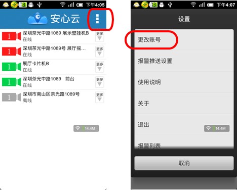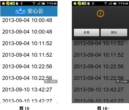 查看報(bào)警記錄。在軟件的主界面,即設(shè)備列表處,點(diǎn)擊(菜單按鈕),在彈出的下拉菜單中選擇“報(bào)警列表,則會(huì)顯示出用戶名下所有報(bào)警設(shè)備發(fā)生的報(bào)警的歷史記錄,點(diǎn)擊可進(jìn)行“查看”或“刪除”。如圖15—16所示。