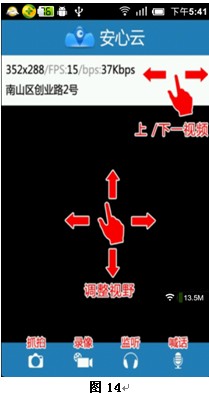 可對前端設(shè)備進(jìn)行喊話。當(dāng)喊話完畢需在次點(diǎn)擊監(jiān)聽按鈕,才可聽取前端說話(需前端設(shè)備支持語音功能,且設(shè)備的音頻功能開啟時(shí)才可進(jìn)行監(jiān)聽和對講)。在視頻監(jiān)控區(qū)域,通過手指在屏幕上滑動(dòng),來控制設(shè)備的上,下,左,右調(diào)整監(jiān)控角度(此項(xiàng)操作需前端設(shè)備支持云臺(tái)功能)。在文本區(qū)域內(nèi),通過手指左,右滑動(dòng),可切換到上一個(gè)或者下一個(gè)攝像機(jī)的視頻畫面。點(diǎn)擊視頻監(jiān)控區(qū)域可切換成全屏模式。
