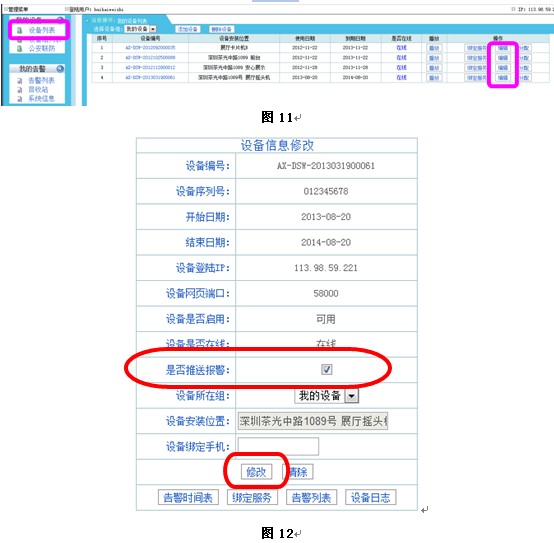 1)首先在PC端進(jìn)入服務(wù)器平臺(tái)www.isee119.com輸入用戶名和密碼登錄,點(diǎn)擊設(shè)備列表,選擇要報(bào)警推送的設(shè)備點(diǎn)擊編輯,在出現(xiàn)的“設(shè)備信息修改”頁面中“是否推送報(bào)警”選項(xiàng)“打勾”,然后點(diǎn)擊“修改”保存。如圖11—12所示。