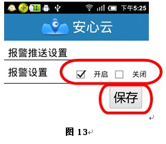 (菜單按鈕),在彈出的下拉菜單中選擇“報(bào)警推送設(shè)置”,報(bào)警設(shè)置選擇“開啟”或者“關(guān)閉”,選擇完畢點(diǎn)擊“保存”即可。如圖13所示。